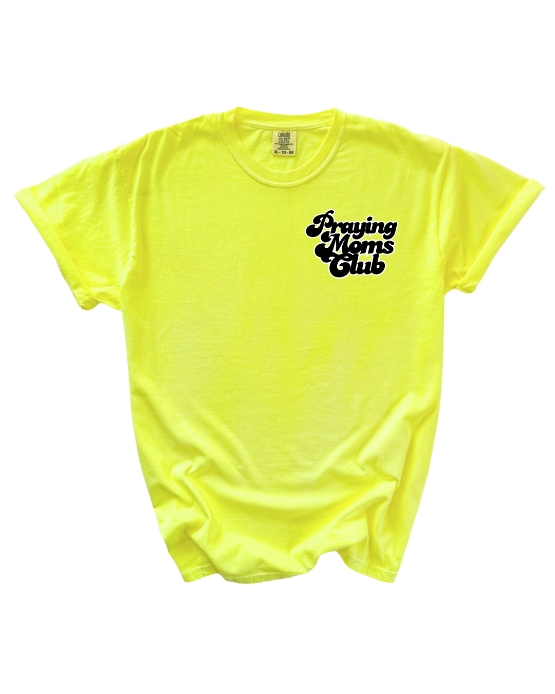 Printed on both the front and back, this tee is for the moms who carry their kids in their hearts and in their prayers. Whether you’re running errands or walking into a prayer circle, wear it as a reminder you’re not doing this alone. Available in classic black and Comfort Colors Neon Lemon, printed on a boxy, broken-in tee.